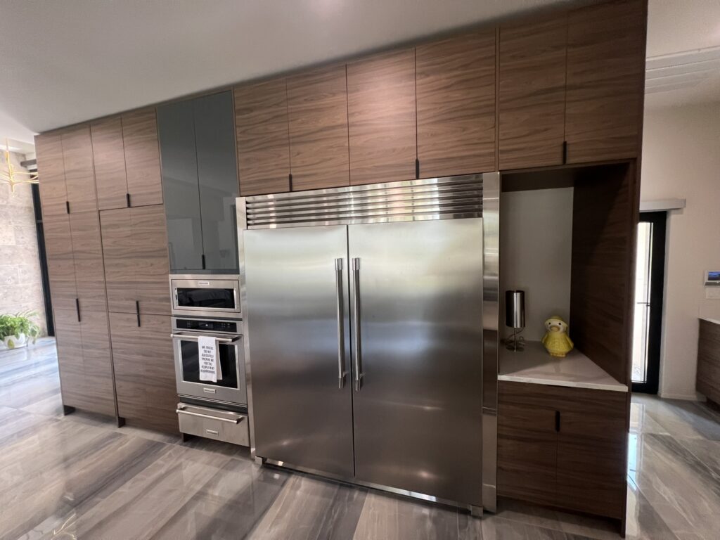 The video above shows our high-gloss acrylic pebble cabinet with motorized horizontal lift doors. Also in our showroom, the matte PET charcoal push to open tall cabinet, with integrated LED strip lighting on the inside and toe kick.