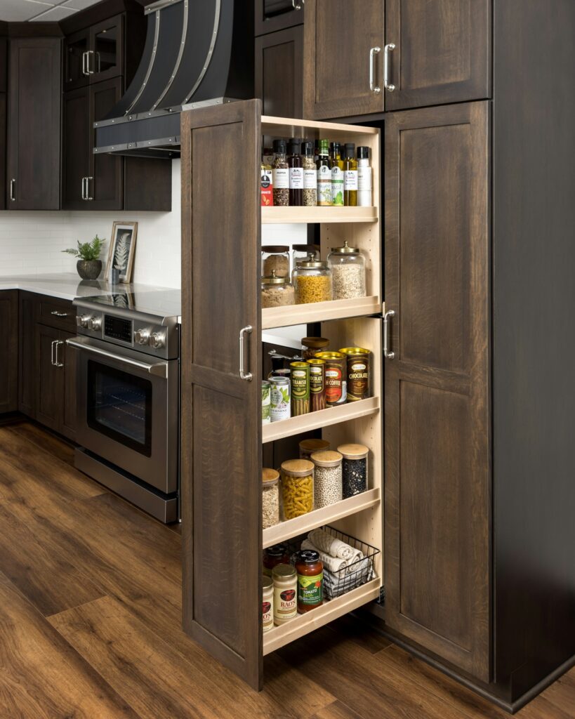 Shown above is a full height pantry cabinet pull out organizer. Multiple pullout organizers can be utilized to allow easy access to all the items stored inside your pantry.